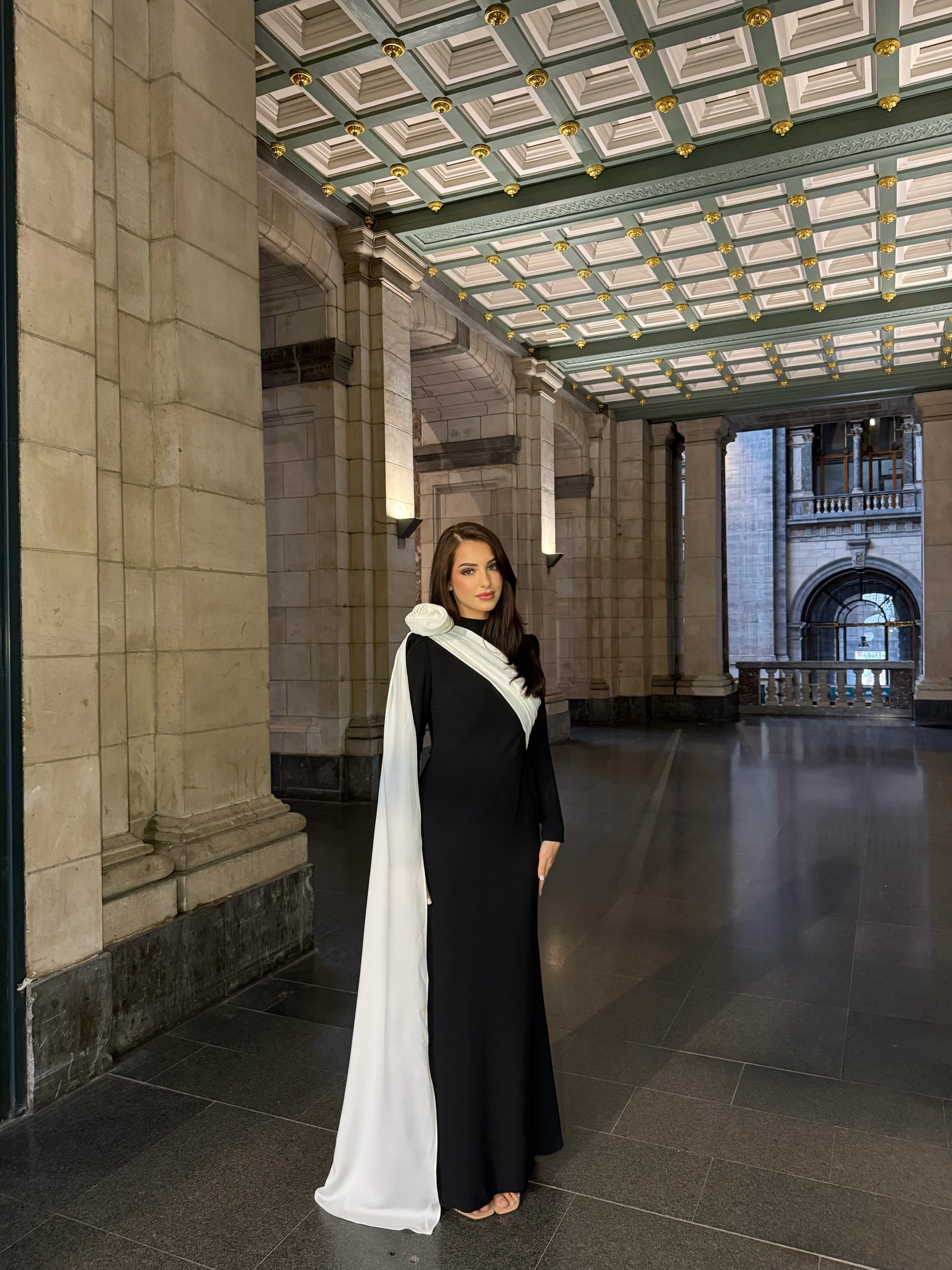Elevate your evening elegance with this striking mermaid gown, where sophisticated black-and-white contrast meets dimensional floral artistry. The long sleeves provide refined coverage while the meticulously crafted 3D flowers create dramatic visual interest across the silhouette. The classic mermaid cut hugs your curves gracefully before flowing into an impressive train, making this piece ideal for formal galas, black-tie events, and unforgettable celebrations. Premium construction ensures both comfort and confidence as you command attention throughout the night.