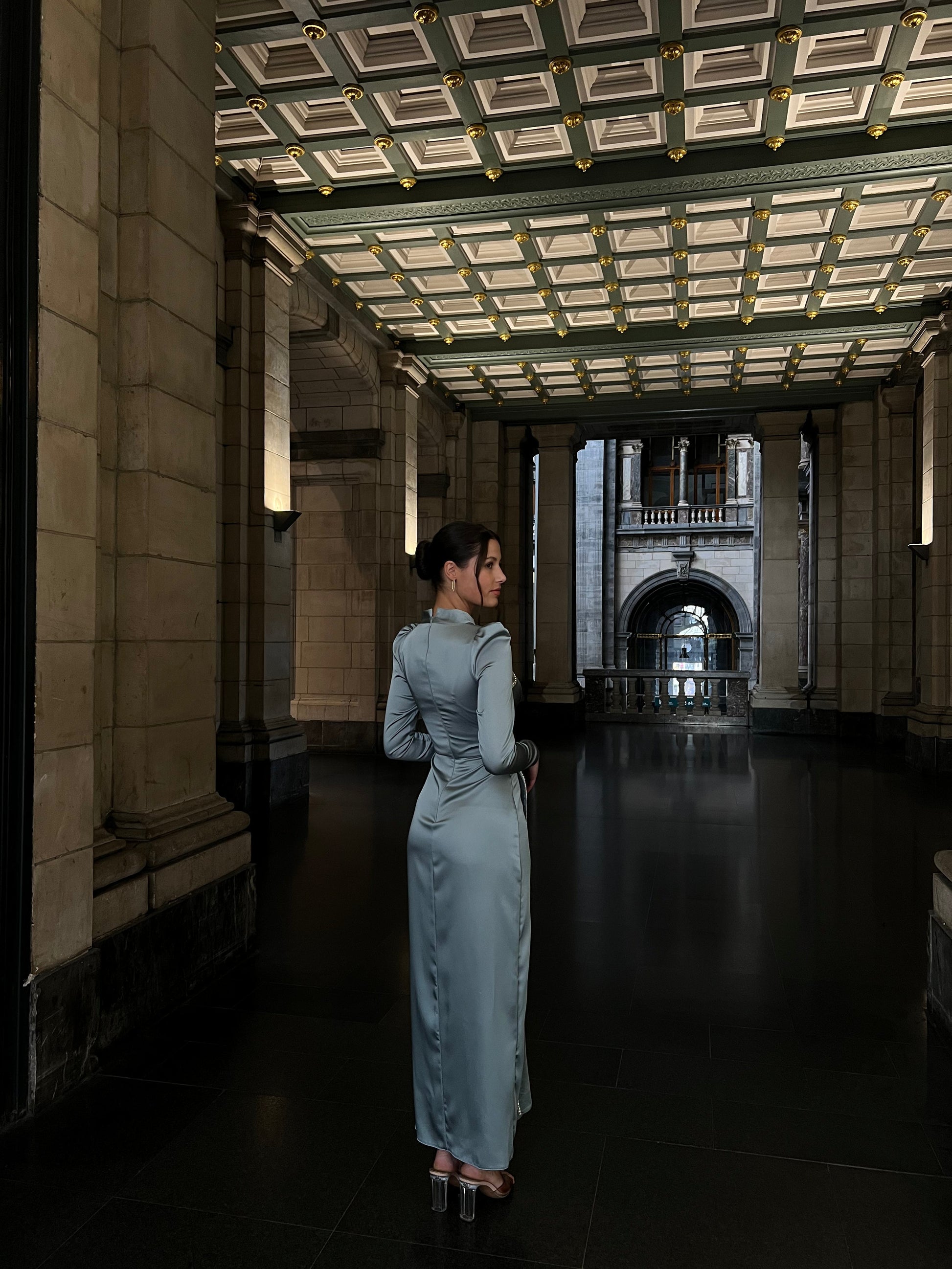 Elevate your evening wardrobe with this sophisticated blue dress, designed for refined occasions. The high neckline and full-length sleeves provide elegant coverage, while the ankle-length silhouette creates a graceful, timeless silhouette. Crafted with attention to detail, this piece combines classic styling with contemporary appeal, making it an ideal choice for formal events, galas, or upscale gatherings. The rich blue tone complements various skin tones and pairs effortlessly with statement jewelry or classic accessories for a polished, memorable look.