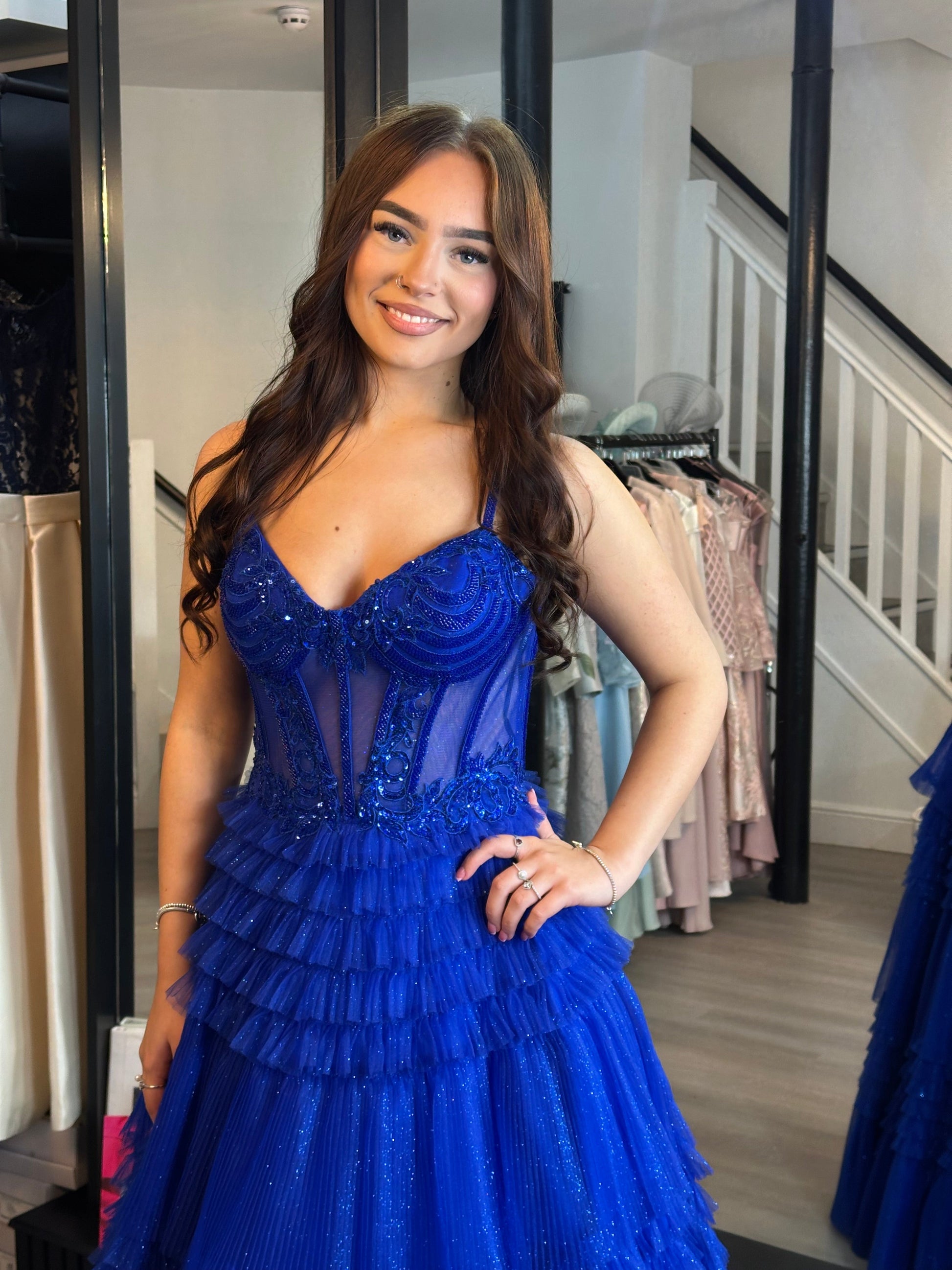 Elevate your prom night with this sophisticated tulle gown, featuring delicate spaghetti straps and a flattering V-neckline. The structured corset bodice provides elegant support and definition, while layers of ethereal tulle create a graceful, voluminous silhouette. This timeless design combines classic elegance with contemporary style, ensuring you make a memorable entrance. Perfect for those seeking a refined, romantic look that balances structure with flowing femininity.
